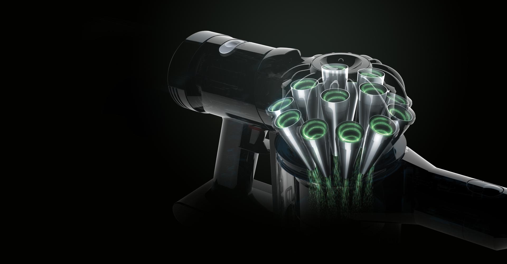 15 small cyclones each generate powerful g-forces to fling dust into the bin. The post-motor filter is 1.5m of ePTFE porous membrane sandwiched between layers of PE/PET, folded 158 times to fit in a compact space. It's optimised to provide filtration with minimal pressure consumption, for more suction. So it captures microscopic dirt particles as small as 0.3 microns – almost 100 times smaller than the width of a human hair.